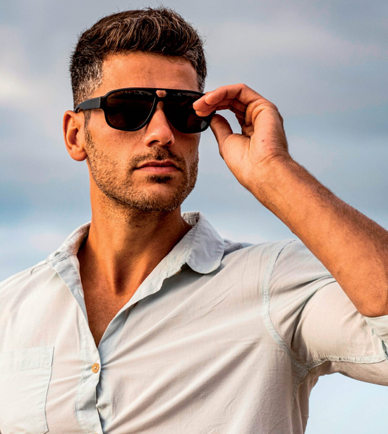 Smiling man wearing Revex sunglasses, white T-shirt and open denim shirt against a grey background