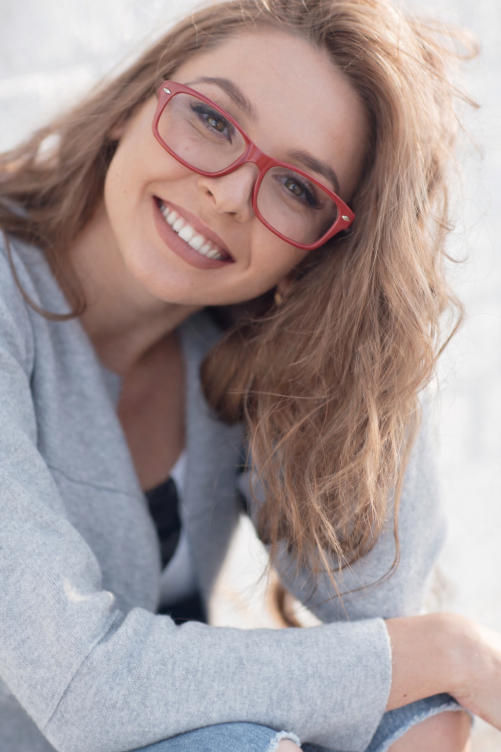 Woman with brown hair wears stylish transparent blue-light glasses against a light background.